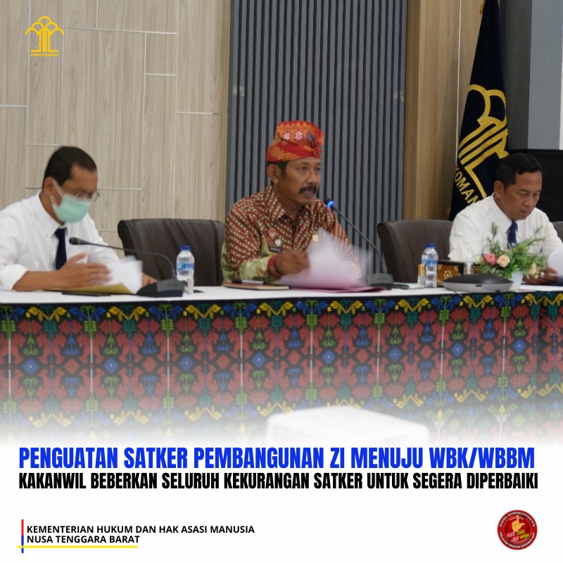 (Vibizmedia – Nasional) Mataram 2 September 2021 – Bertempat di Aula Kantor Wilayah Kementerian Hukum dan HAM Nusa Tenggara Barat, Kepala Kantor Wilayah beserta seluruh Kepala Divisi melakukan monitoring penguatan Satuan Kerja terkait Pembangunan ZI menuju WBK/WBBM. Dalam kesempatan kali ini, seluruh Satuan Kerja hadir ditempat, serta untuk Satuan Kerja di Pulau Sumbawa mengikuti giat tersebut secara virtual.