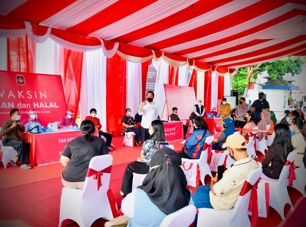 (Vibizmedia-Nasional) Presiden Joko Widodo meninjau pelaksanaan vaksinasi Covid-19 bagi masyarakat yang digelar di Pusat Informasi Pariwisata dan Perdagangan (PIPP), Kota Blitar, pada Selasa, 7 September 2021. Dalam kesempatan tersebut, Presiden menyampaikan apresiasinya kepada masyarakat Kota Blitar yang telah antusias mengikuti program vaksinasi Covid-19.
