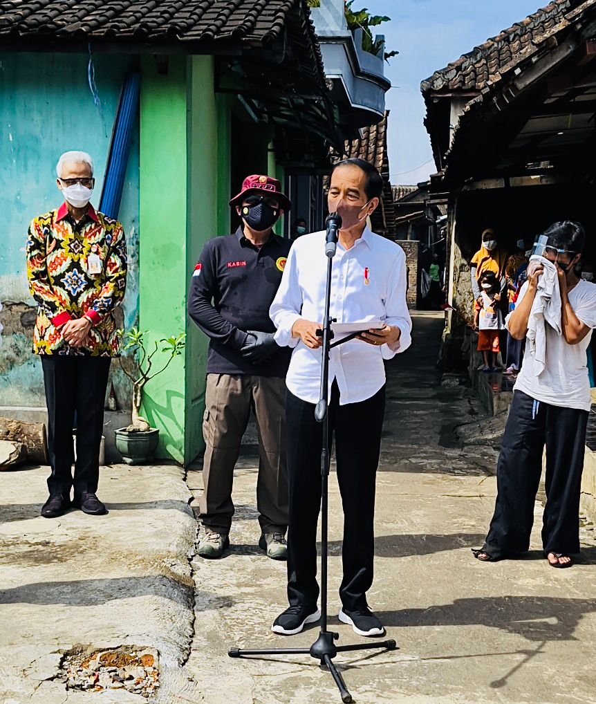 Presiden Joko Widodo bersama Ibu Negara Iriana Jokowi mengunjungi Dukuh Ngledok, Desa Segaran, Kecamatan Delanggu, Kabupaten Klaten, untuk meninjau langsung program vaksinasi Covid-19 kepada masyarakat secara pintu ke pintu, pada Senin, 13 September 2021. FOTO: BIRO PERS SETPRES