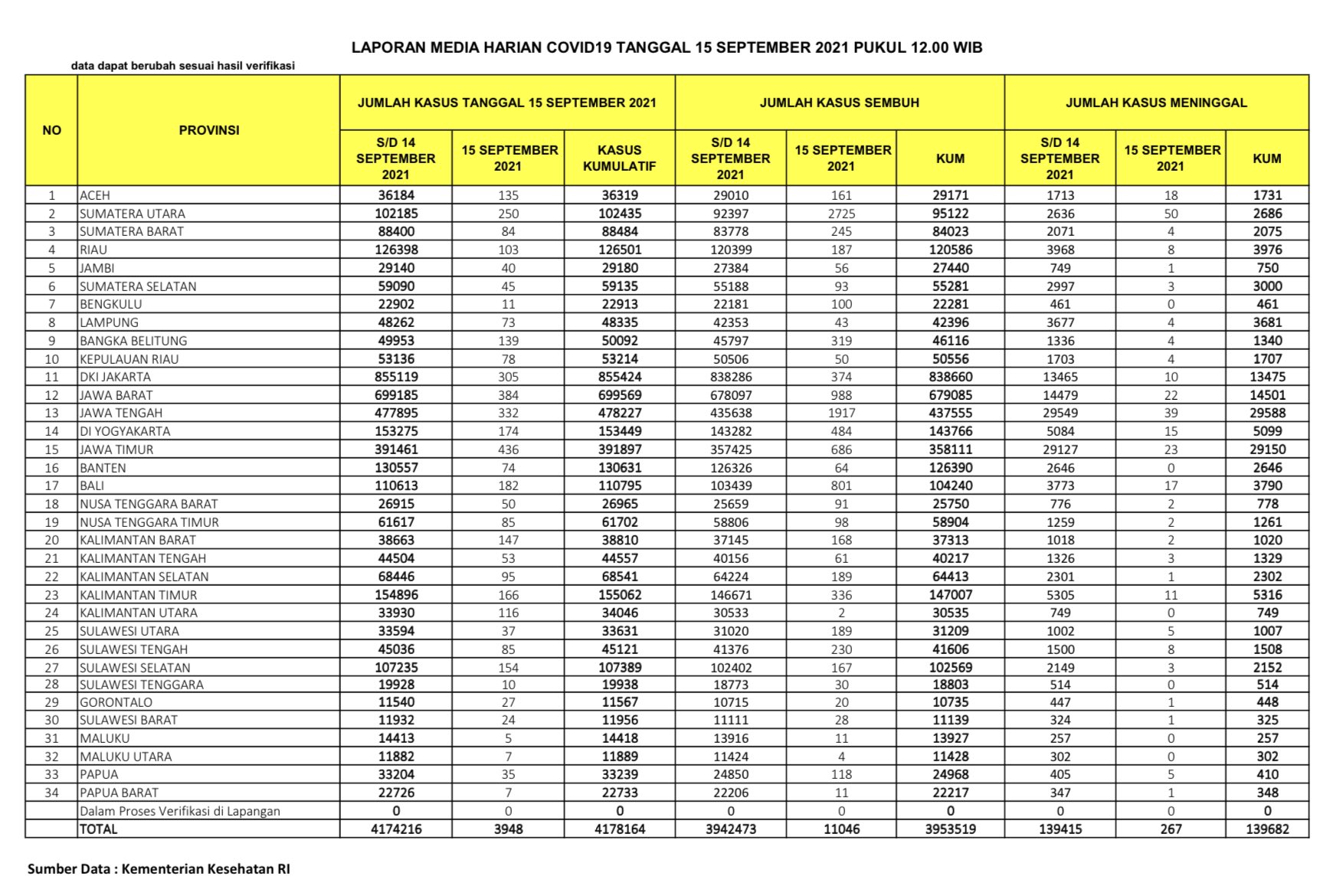 Berikut adalah data COVID-19 di seluruh provinsi pada tanggal 15 September 2021: