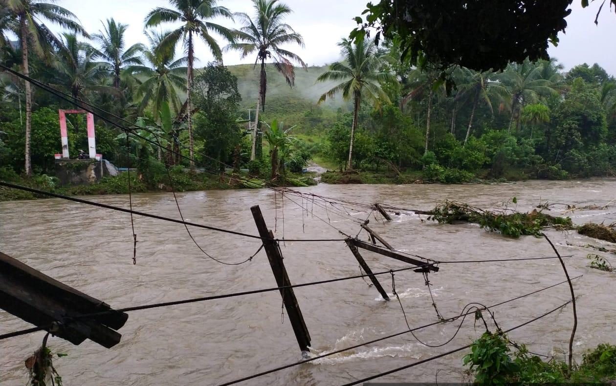 Banjir mengakibakan satu jembatan penghubung antar dua desa rusak berat di wilayah Kabupaten Buru, Provinsi Maluku. FOTO: BNPB