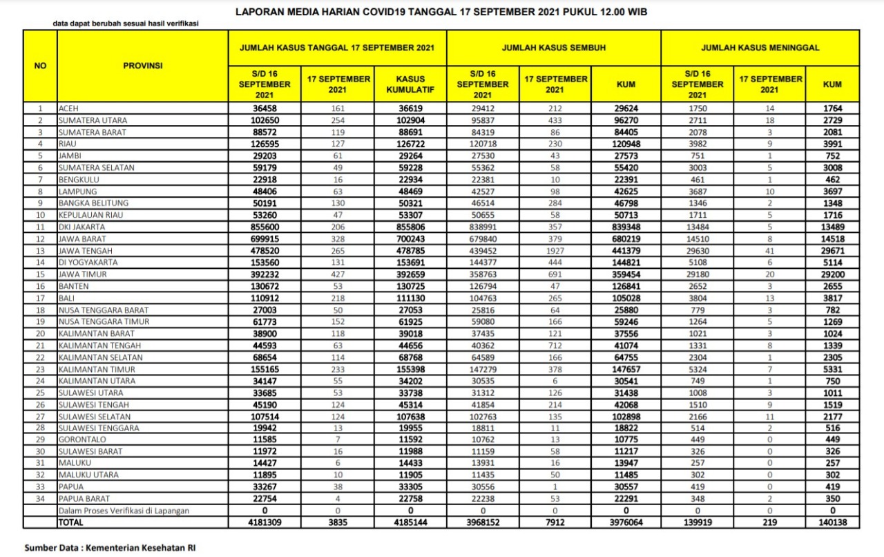 Berikut adalah data COVID-19 di seluruh provinsi pada tanggal 17 September 2021: