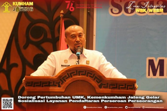 (Vibizmedia – Nasioanal) SEMARANG Kantor Wilayah Kementerian Hukum dan HAM Jawa Tengah kembali memberikan pemahaman kepada masyarakat.Mengenai Layanan Pendaftaran Perseroan Perseorangan. Kepala Kantor Wilayah Kementerian Hukum dan HAM Jawa Tengah A Yuspahrudin melalui Kepala Divisi Pelayanan Hukum dan HAM, Bambang Setyabudi dalam sambutannya mengatakan dengan disahkannya Undang – Undang Cipta Kerja akan memberikan kemudahan kepada Usaha Mikro dan Kecil utamanya dalam mendirikan perseroan perorangan.