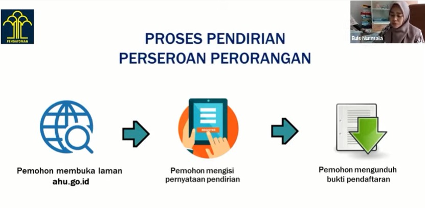 Kegiatan mengundang narasumber dari Direktorat Jenderal Administrasi Hukum Umum Kemenkumham yang memberikan pemaparan materi mengenai Perseroan Perorangan Yang Memenuhi Kriteria Untuk UMK