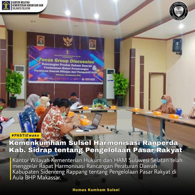 (Vibizmedia – Nasional) Kantor Wilayah Kementerian Hukum dan HAM Sulawesi Selatan telah menggelar Rapat Harmonisasi Rancangan Peraturan Daerah Kabupaten Sidenreng Rappang tentang Pengelolaan Pasar Rakyat di Aula BHP Makassar.