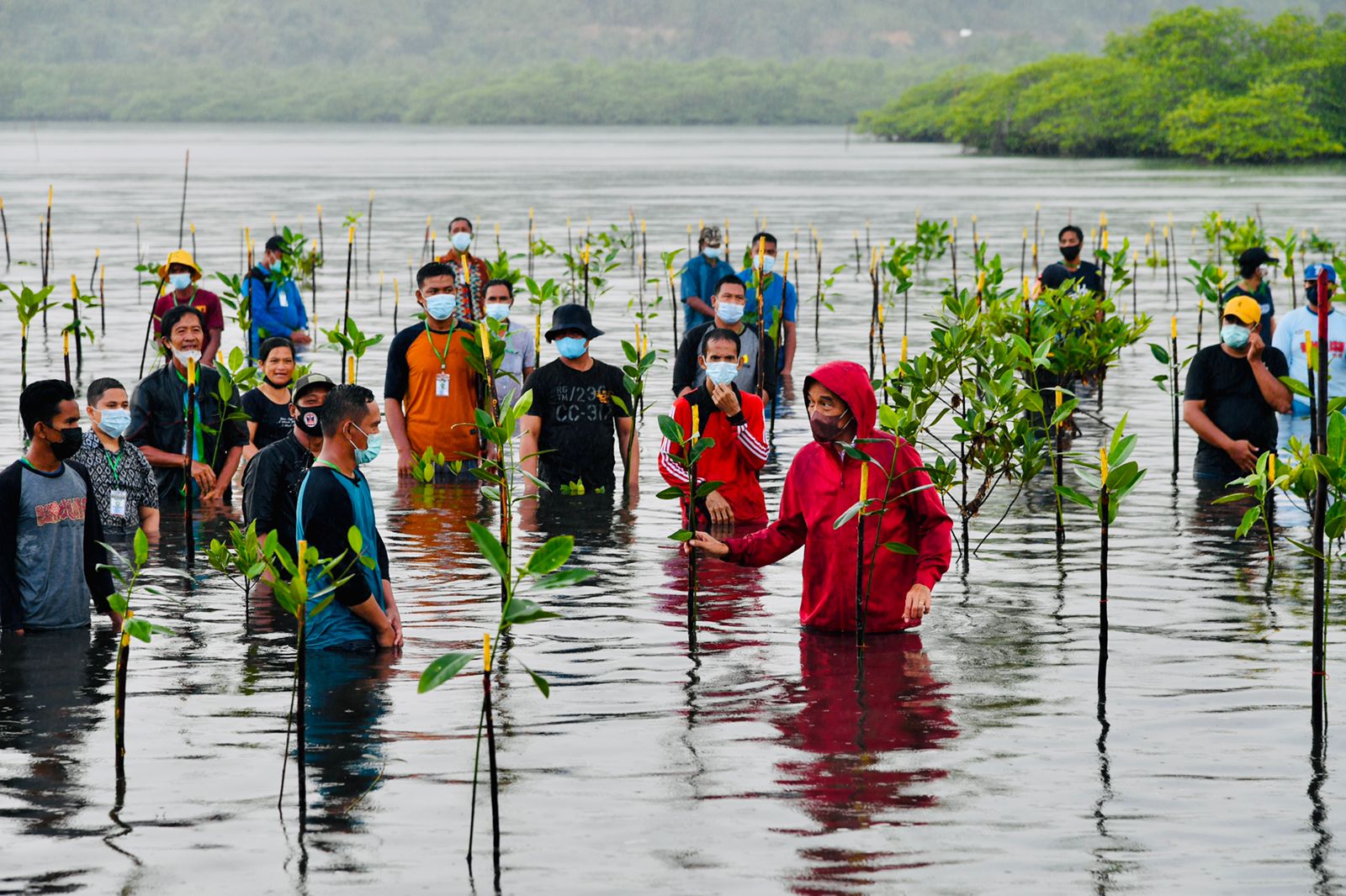 Presiden Joko Widodo menanam mangrove bersama masyarakat di Pantai Setokok, Kecamatan Bulang, Kota Batam, Provinsi Kepulauan Riau, pada Selasa, 28 September 2021. FOTO: BIRO PERS SETPRES