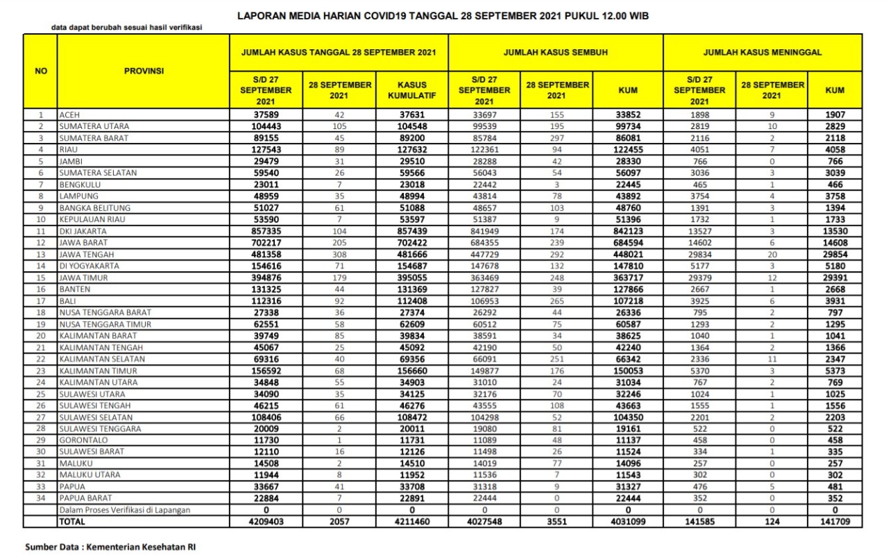 (Vibizmedia – Nasional) Berikut adalah angka akumulatif perkembangan data kasus Covid-19 dari seluruh Indonesia hingga tanggal 28 September 2021