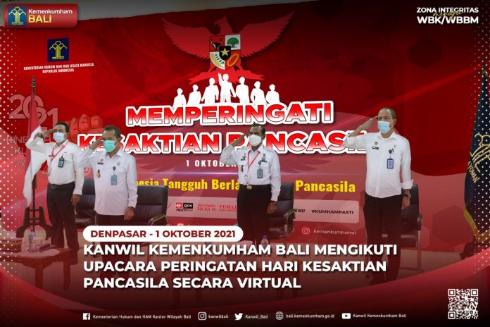 (Vibizmedia – Nasional) Peringatan Hari Kesaktian Pancasila berlokasi di Ruang Dharmawangsa Kantor Wilayah Kementerian Hukum dan HAM Bali pada Hari Jumat 01 Oktober 2021, Kepala Kantor Wilayah Kementerian Hukum dan HAM Bali (Jamaruli Manihuruk) bersama Para Pimpinan Tinggi Pratama mengikuti upacara secara virtual.