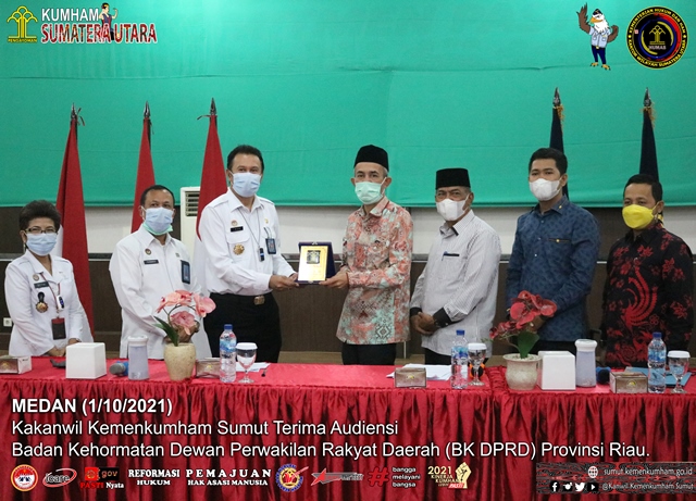(Vibizmedia – Nasional) Medan – Kepala Kantor Wilayah Kementerian Hukum dan Hak Asasi Manusia (Kemenkumham) Sumatera Utara Imam Suyudi hari ini, Jum’at (1/10), turut mendampingi Kepala Divisi Administrasi Betni Humiras Purba dan Kepala Divisi Pelayanan Hukum dan HAM Purwanto menerima kunjungan Badan Kehormatan Dewan Perwakilan Rakyat Daerah (BK DPRD) Provinsi Riau yang bertempat di Aula Soepomo Kanwil Kemenkumham Sumut.
