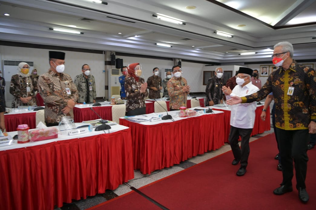 “Saya memandang strategi penanggulangan kemiskinan yang ditetapkan oleh Provinsi Jawa Tengah sudah sesuai dengan strategi penanggulangan kemiskinan dan khususnya untuk kemiskinan ekstrem. Saya juga mengapresiasi program-program inovasi yang dimiliki oleh Pemerintah Provinsi Jawa Tengah yang komplemen dengan program-program pusat,” ungkap Wapres ketika memimpin Rapat Koordinasi Percepatan Penanggulangan Kemiskinan Ekstrem dengan Gubernur dan 5 Bupati Kabupaten Prioritas di Provinsi Jawa Tengah Tahun 2021 secara langsung di Gedung Gradhika Bakti Praja Lt. 2, Jl. Pahlawan No.9, Kota Semarang, Jawa Tengah, Kamis (07/10/2021).
