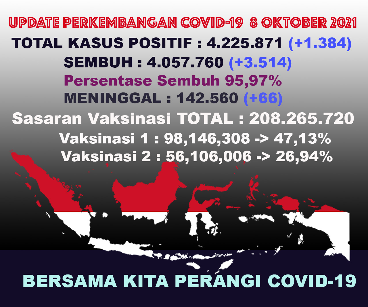 (Vibizmedia – Nasional) Berikut adalah angka akumulatif perkembangan data kasus Covid-19 dari seluruh Indonesia hingga tanggal 8 Oktober 2021