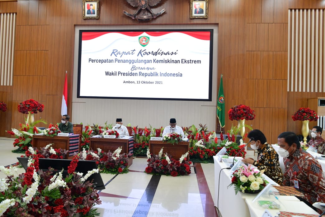 “Pemilihan lima kabupaten ini didasarkan pada indeks kemiskinan ekstrem, yang dihasilkan dari kombinasi persentase penduduk miskin ekstrem dan jumlah penduduk miskin ekstrem menurut kabupaten, bersumber dari data BPS yang dihasilkan melalui SUSENAS Maret 2020 sebagai rujukan utama,” papar Wakil Presiden (Wapres) K.H. Ma’ruf Amin saat memimpin Rapat Koordinasi Percepatan Penanggulangan Kemiskinan Ekstrim dengan Gubernur Maluku dan 5 Bupati di Kantor Gubernur, Jalan Pattimura Nomor 1, Ambon.