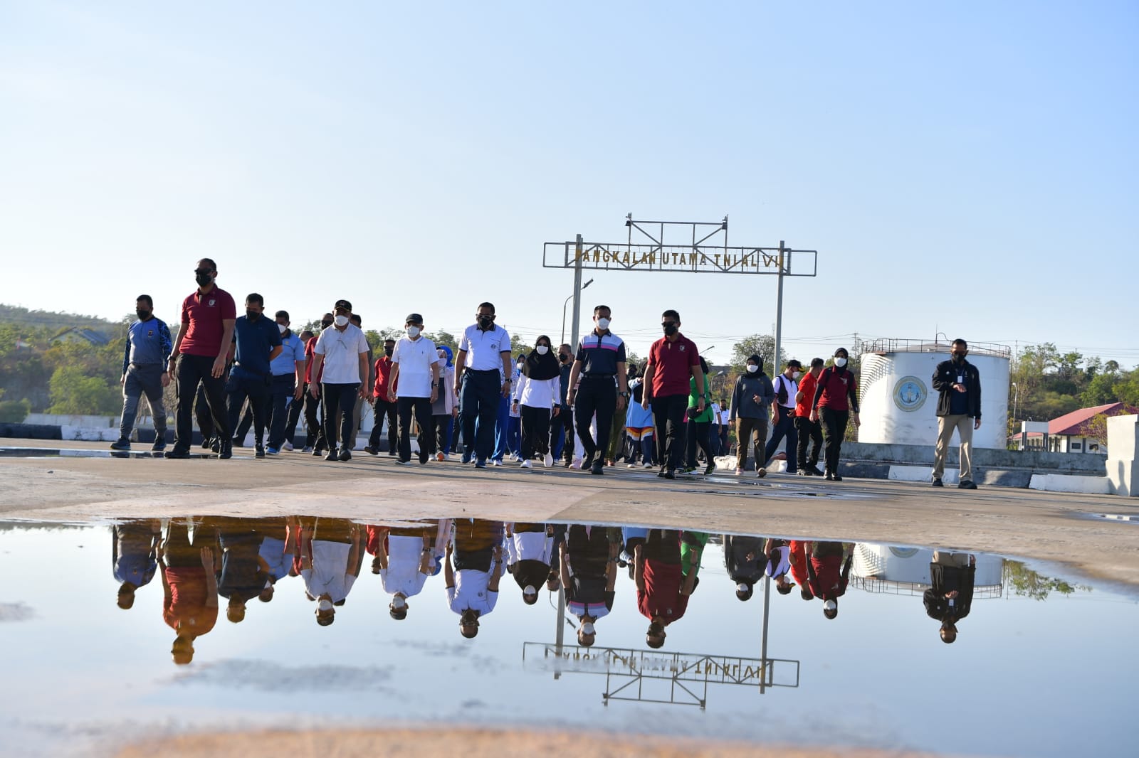 (Vibizmedia – Kupang) Mengawali kegiatan Minggu Pagi di Kupang, Nusa Tenggara Timur, Wakil Presiden (Wapres) K.H. Ma’ruf Amin didampingi oleh Ibu Hj. Wury Ma’ruf Amin dan Menteri Koordinator Bidang Pembangunan Manusia dan Kebudayaan (Menko PMK) Muhadjir Effendy melakukan olahraga pagi di Pangkalan Utama TNI Angkatan Laut (Lantamal) VII Kupang, Minggu (17/10/2021).