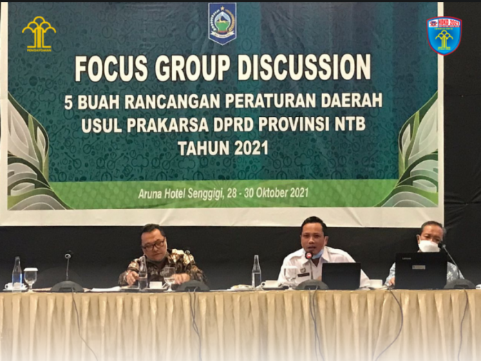 (Vibizmedia – Nasional) Ntb.kemenkumham.go.id – 28-30 Oktober 2021 bertempat di Hotel Aruna Senggigi, Perancang Peraturan Perundang Undangan Kanwil Kementerian Hukum dan HAM NTB yang diwakili oleh Suyanto Edi Wibowo serta Baiq Rara Charina Sizi menghadiri FGD 5 buah raperda usul prakarsa DPRD Provinsi NTB Tahun 2021.  Acara FGD dibuka langsung oleh Ketua DPRD Prov NTB Baiq Isvie Rupaeda serta dihadiri oleh Ketua dan anggota Bapemperda DPRD Prov NTB, Kepala Biro Hukum Provinsi NTB Ruslan Abdul Gani, OPD terkait, serta tokoh masyarakat. Dalam acara tersebut, Perancang Peraturan Perundang – Undangan Ahli Madya Suyanto Edi Wibowo ditunjuk sebagai narasumber yang menjelaskan secara rinci urgensi pembentukan 5 buah Raperda yang menjadi usul DPRD Provinsi NTB .