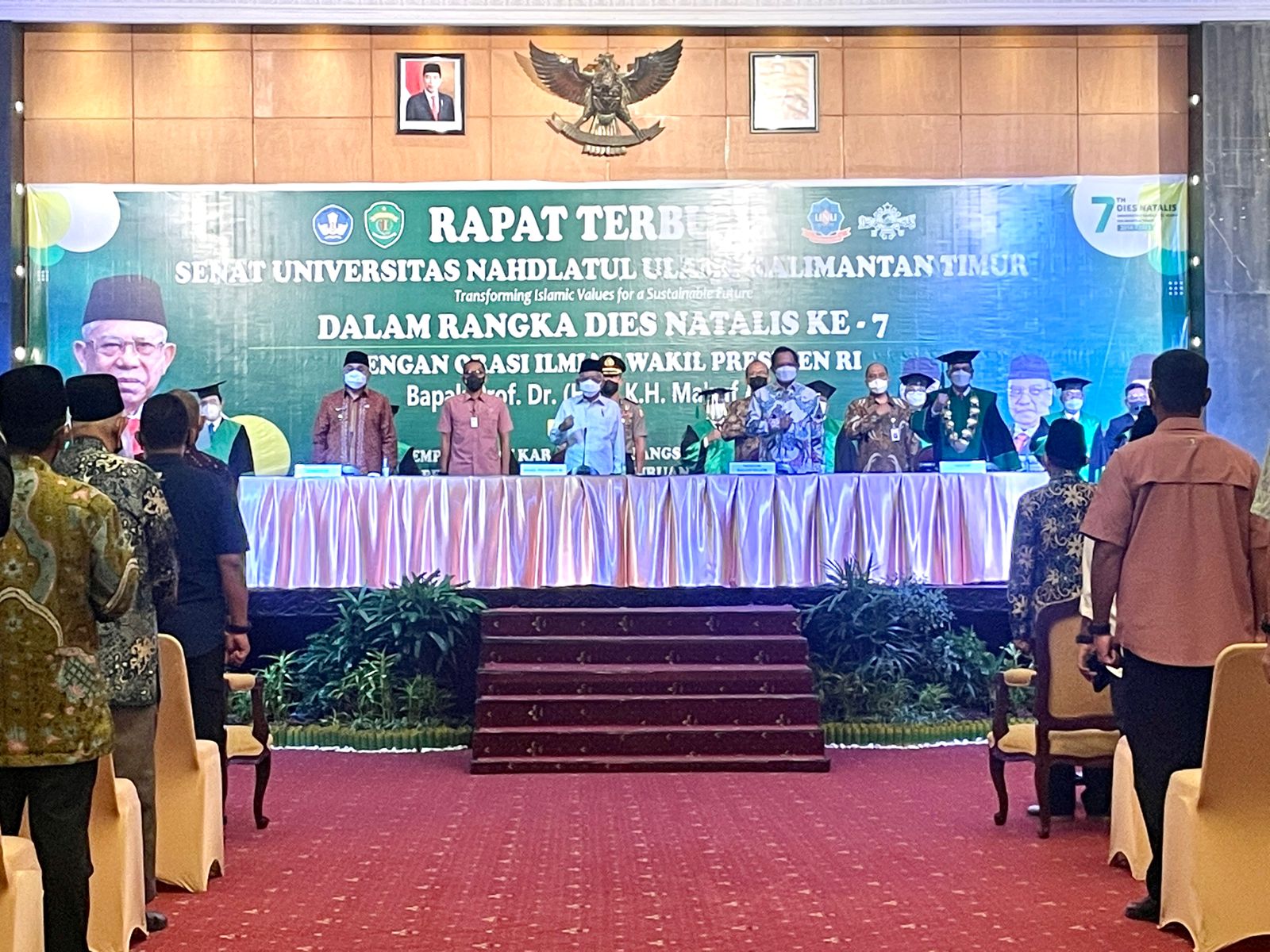 “Perguruan Tinggi sebagai tahap akhir pendidikan formal seyogianya dapat membekali mahasiswa untuk senantiasa berpikir kritis dalam menyikapi arus informasi, dengan berpegang teguh pada akidah, akhlak, dan ilmu pengetahuan,” tutur Wakil Presiden (Wapres) K. H. Ma’ruf Amin saat memberikan orasi ilmiah dalam rangka Dies Natalis ke-7 Universitas Nahdlatul Ulama (UNU) Kalimantan Timur di Grand Ballroom Hotel Bumi Senyiur Samarinda, Selasa (2/11/2021).