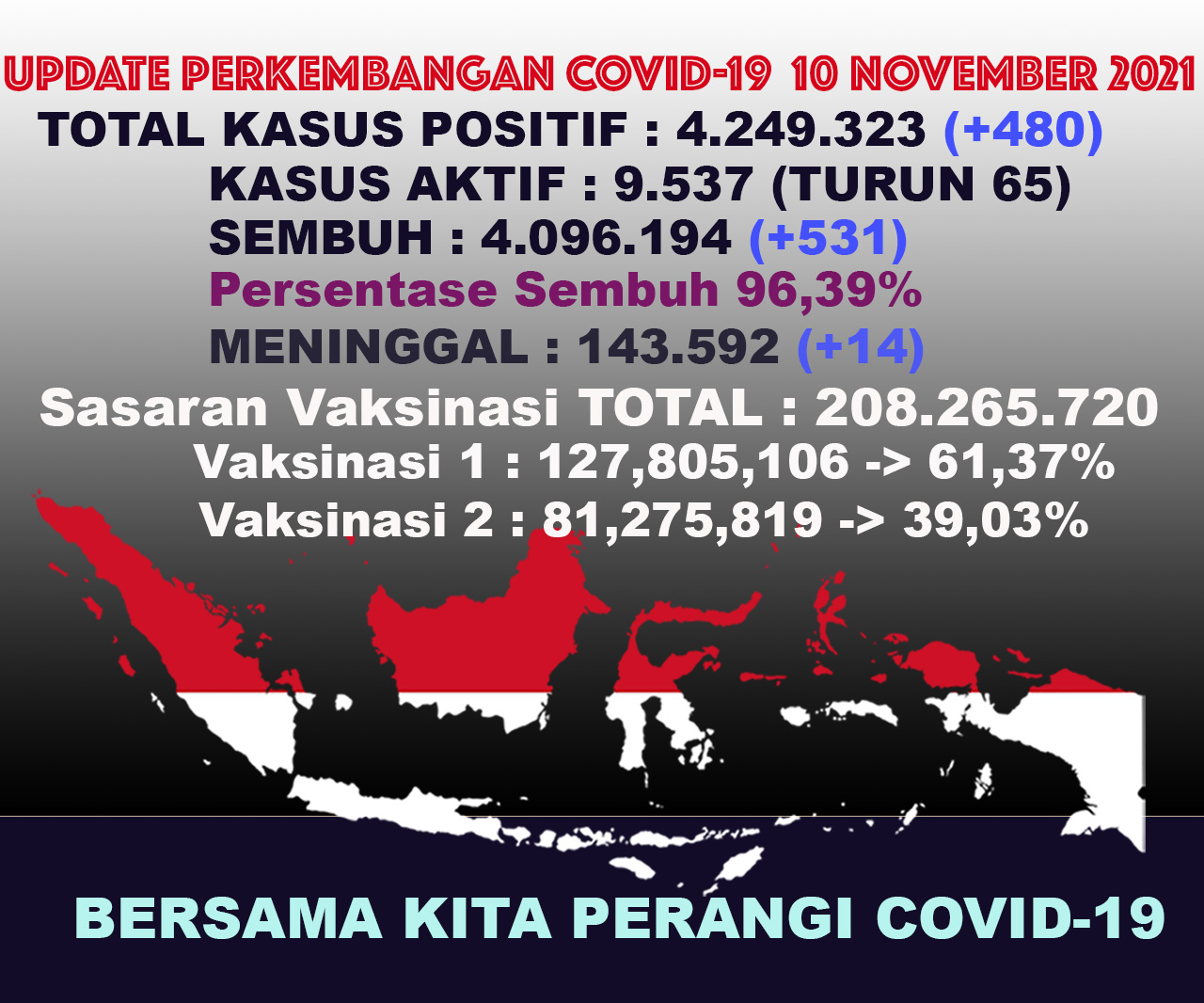 (Vibizmedia – Nasional) Berikut adalah angka akumulatif perkembangan data kasus Covid-19 dari seluruh Indonesia hingga tanggal 10 November 2021