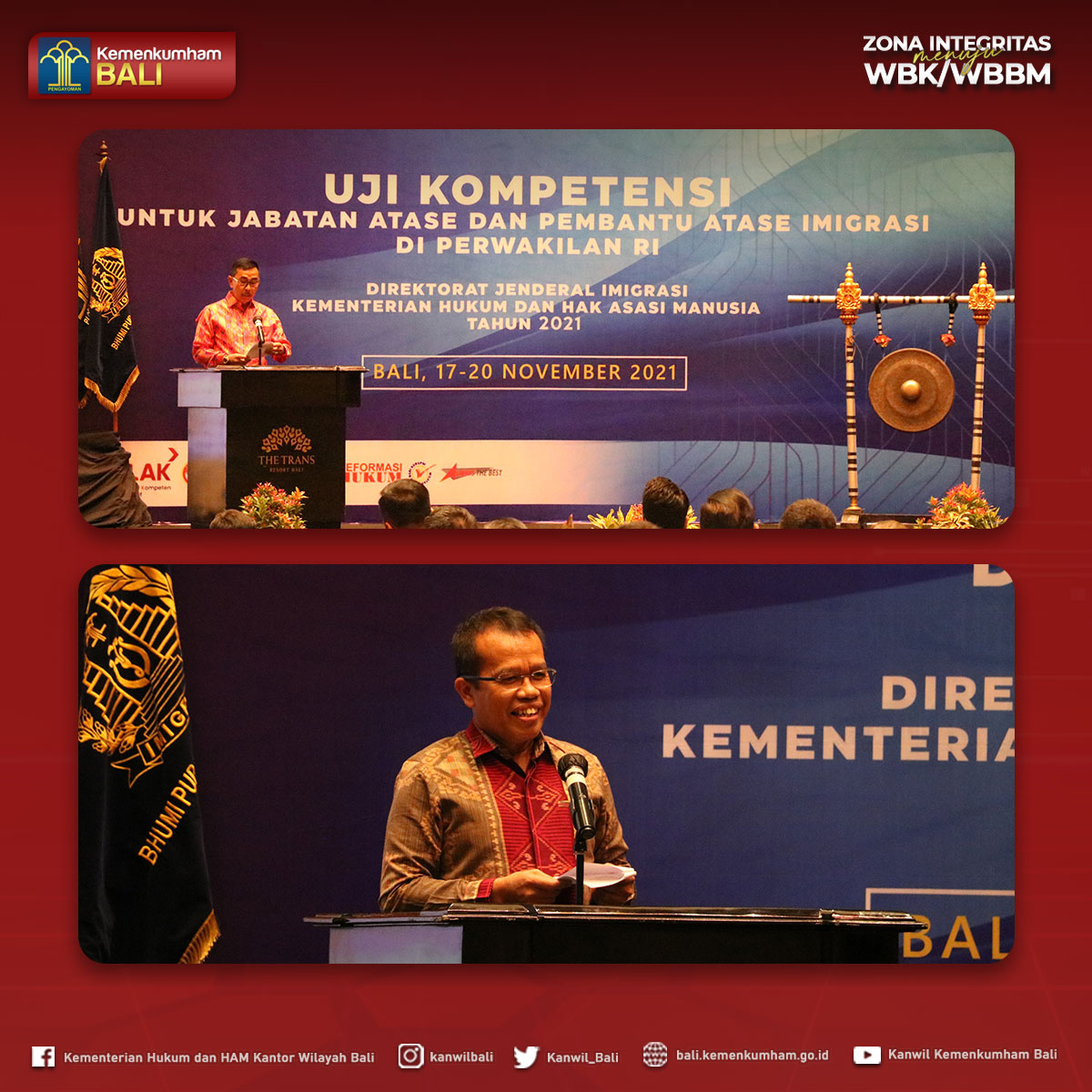 (Vibizmedia – Nasional) BADUNG – Kamis, 18 November 2021 Bertempat di The Trans Resort Bali, Kepala Kantor Wilayah Kementerian Hukum dan HAM Bali (Jamaruli Manihuruk) didampingi Kepala Divisi Keimigrasian (Amrizal), Kepala Kantor Imigrasi Kelas I Khusus TPI Ngurah Rai (Surya Mataram) menghadiri Pembukaan Kegiatan Uji Kompetensi Pejabat Imigrasi untuk Jabatan Atase dan Pembantu Atase di Perwakilan Luar Negeri RI Direktorat Jenderal Imigrasi Tahun 2021. Hadir dalam kesempatan tersebut Kepala Biro Kepegawaian Kementerian Hukum dan HAM RI (Sutrisno), Sekretaris Direktorat Jenderal Imigrasi (Zaeroji), Direktur Sistem dan Teknologi Informasi Keimigrasian (Agato P.P Simamora), Assessor Utama, Administrator, dan Pengawas di Lingkungan Kementerian Hukum dan HAM beserta Assessor dari Dinas Psikologi Markas Besar TNI Angkatan Udara beserta Assessor Utama.