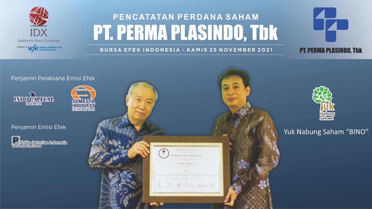 Pada tanggal 16 November 2021 Perseroan telah mendapatkan izin efektif dari Otoritas Jasa Keuangan. Selama masa penawaran umum tanggal 18 – 23 November 2021, saham PT Perma Plasindo mendapatkan minat yang luar biasa dari para investor sehingga seluruh saham yang ditawarkan dapat diserap dengan baik.