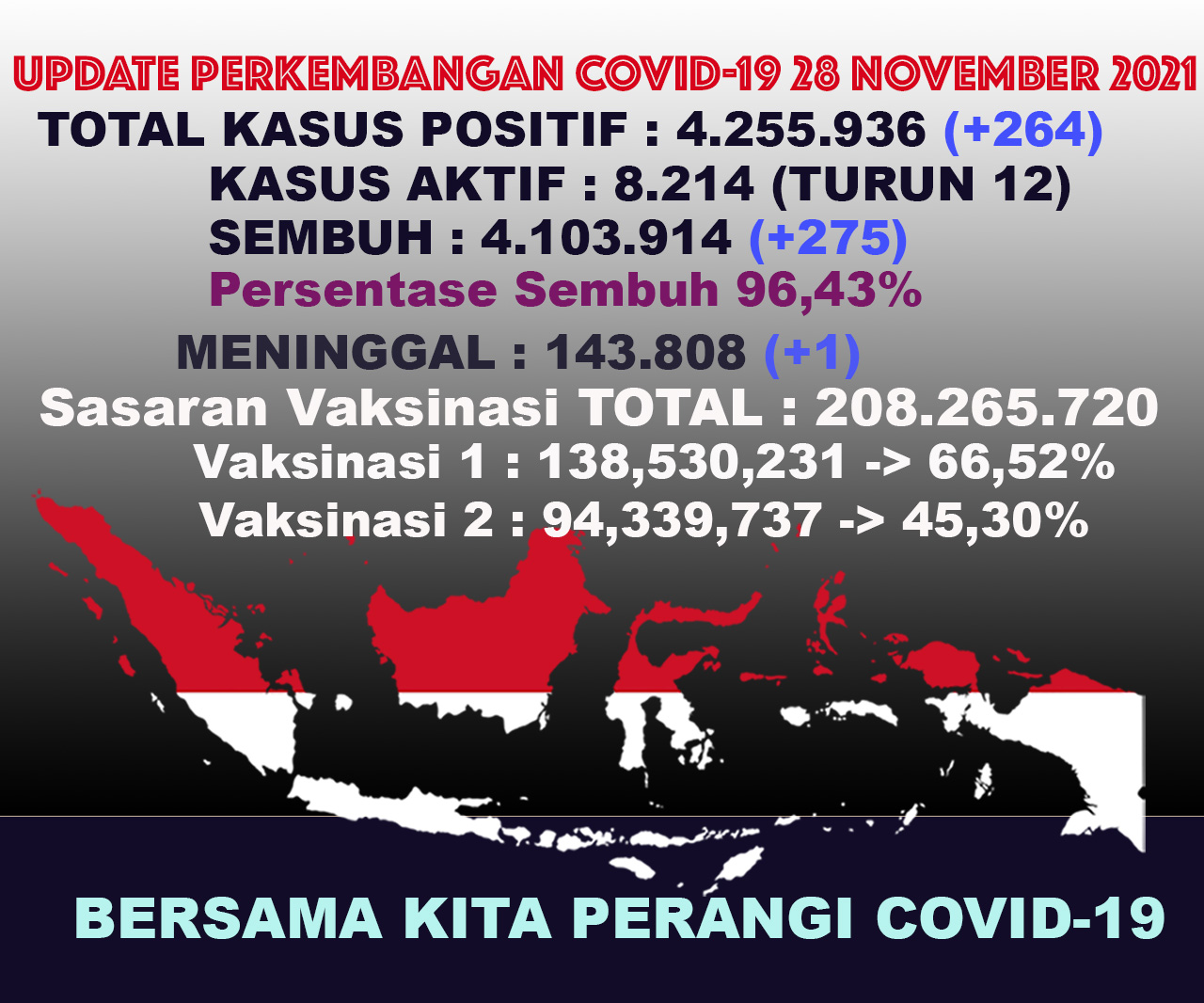 (Vibizmedia – Nasional) Berikut adalah angka akumulatif perkembangan data kasus Covid-19 dari seluruh Indonesia hingga tanggal 28 November 2021.