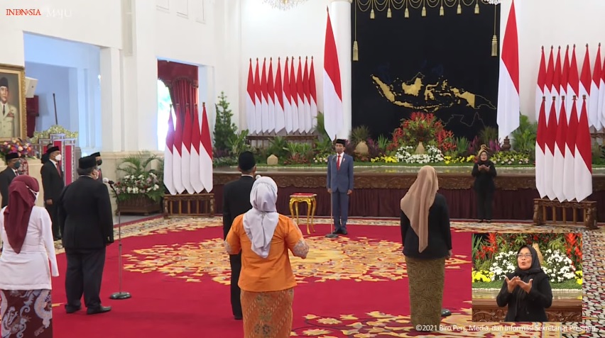 Acara pelantikan yang digelar dengan menerapkan protokol kesehatan secara ketat tersebut diakhiri dengan pemberian ucapan selamat dari Presiden Joko Widodo dan Wakil Presiden Ma’ruf Amin untuk kemudian diikuti oleh sejumlah tamu undangan terbatas lainnya.