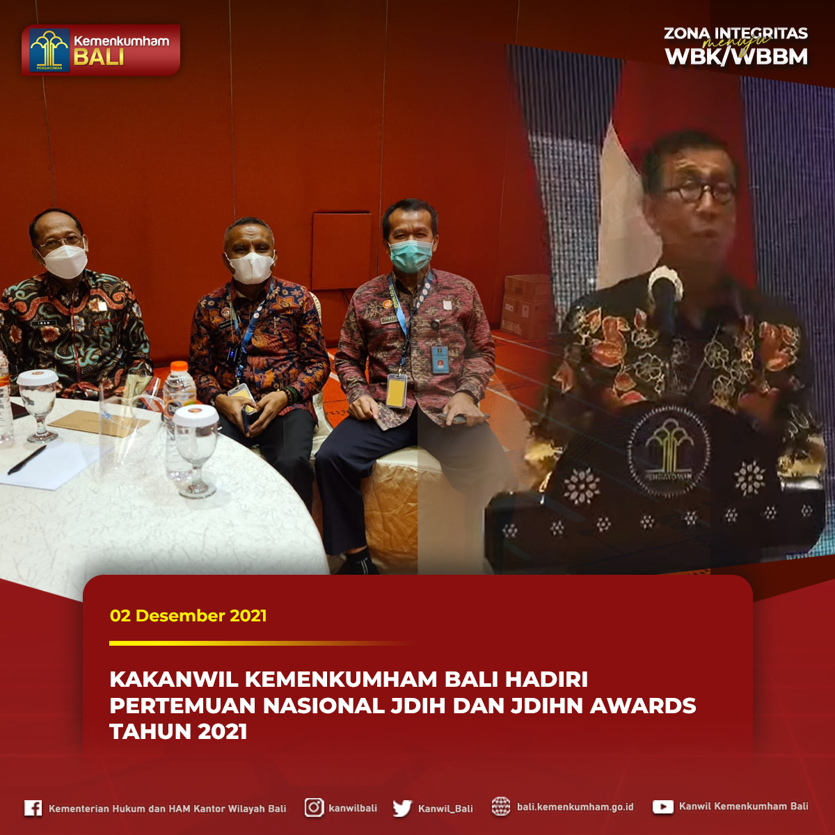 (Vibizmedia – Bali ) JAKARTA – Kamis, 02 Desember 2021 bertempat di Hotel Grand Mercure Harmoni Jakarta, Kepala Kantor Wilayah Kementerian Hukum dan HAM Bali (Jamaruli Manihuruk) menghadiri Pertemuan Nasional Pengelola Jaringan Dokumentasi dan Informasi Hukum (JDIH) dan Pemberian JDIHN Awards Tahun 2021. Hadir dalam acara tersebut Menteri Hukum dan HAM RI (Yasonna H. Laoly), Staf Khusus Menteri Komunikasi dan Informatika RI, Staf Ahli Menteri Bidang Pemerataan dan Kewilayahan Kementerian PPN Bappenas, Inspektur Jenderal, Pimpinan Tinggi Madya Unit Utama, Staf Ahli Menteri, Pimpinan Tinggi Pratama, serta Kepala Kantor Wilayah di Lingkungan Kementerian Hukum dan HAM RI.