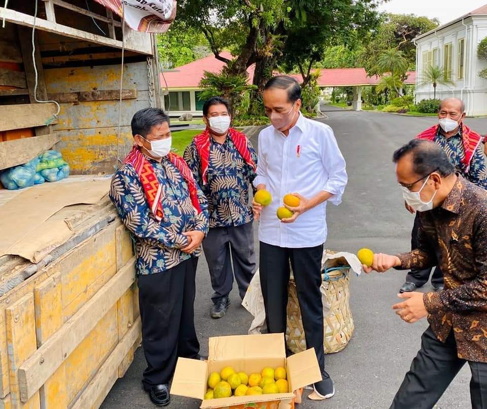 (Vibizmedia-Nasional) Presiden Joko Widodo menerima satu truk berisi buah jeruk sebanyak tiga ton sebagai “oleh-oleh” bagi Presiden Joko Widodo yang dibawa enam perwakilan warga Liang Melas Datas, Kabupaten Karo, Provinsi Sumatera Utara di Istana Merdeka, Jakarta, pada Senin, 6 Desember 2021.