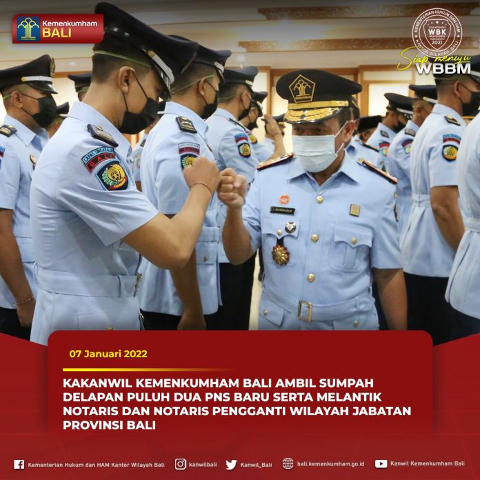 Bertempat di Ruang Dharmawangsa Kanwil Kemenkumham Bali, pengambilan sumpah/janji kepada 82 orang Calon Pegawai Negeri Sipil (CPNS) di Lingkungan Kanwil Kemenkumham Bali serta Pelantikan 1 orang Notaris dan 2 orang Notaris pengganti dipimpin langsung oleh Kakanwil Kemenkumham Bali (Jamaruli Manihuruk). Kegiatan tersebut juga dihadiri oleh Pejabat Administrator, Pejabat Pengawas dan Kepala Unit Pelaksana Teknis di Lingkungan Kanwil Kemenkumham Bali.