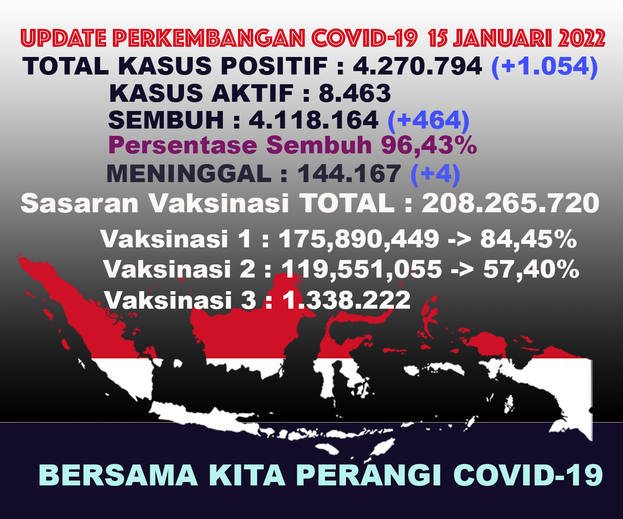 (Vibizmedia – Nasional) Berikut adalah angka akumulatif perkembangan data kasus Covid-19 dari seluruh Indonesia hingga tanggal 15 Januari 2022.