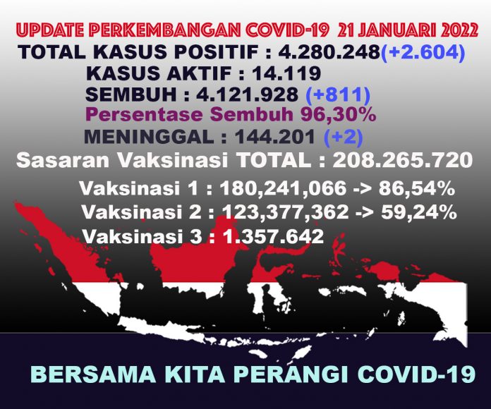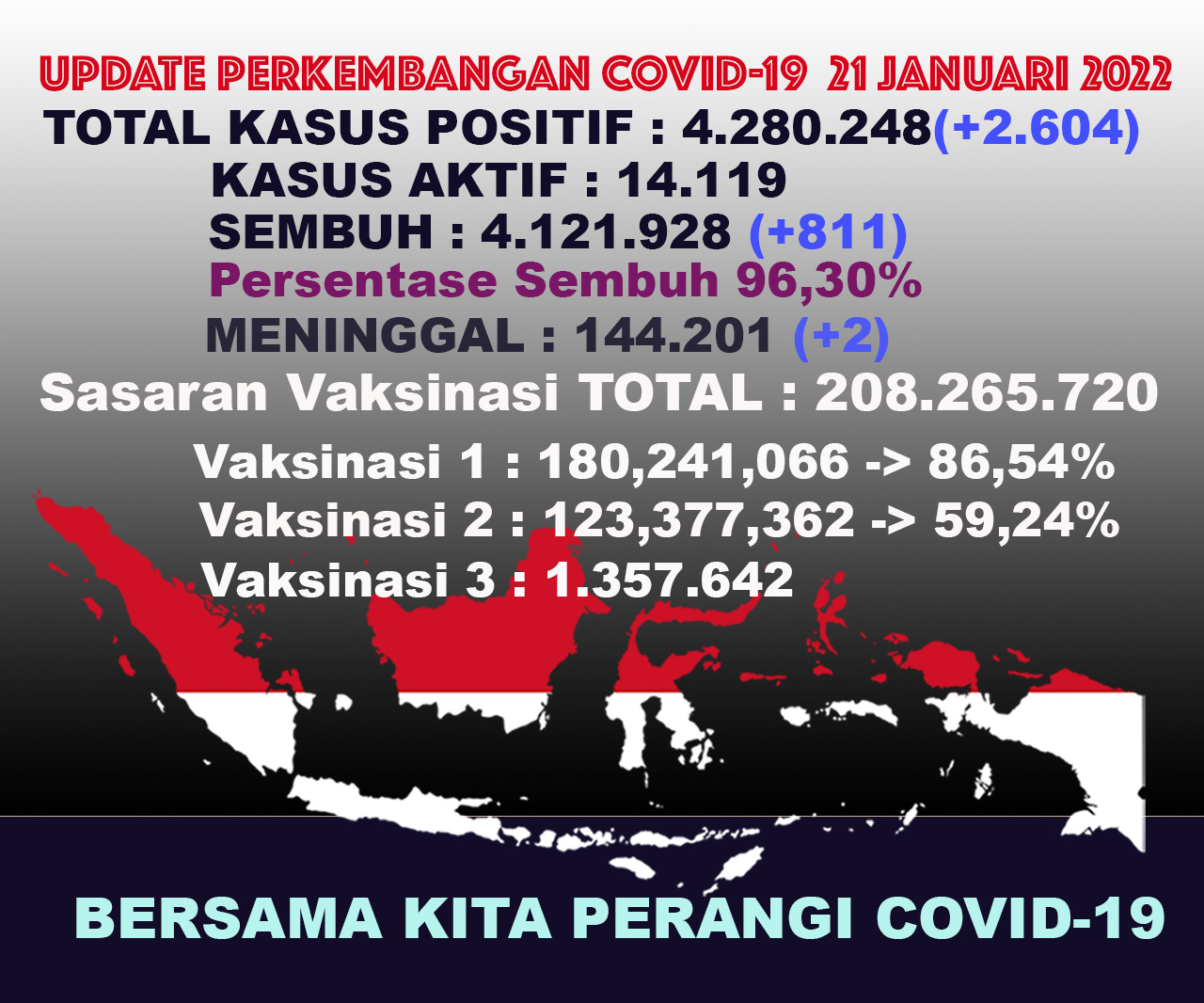 (Vibizmedia – Nasional) Berikut adalah angka akumulatif perkembangan data kasus Covid-19 dari seluruh Indonesia hingga tanggal 21 Januari 2022.