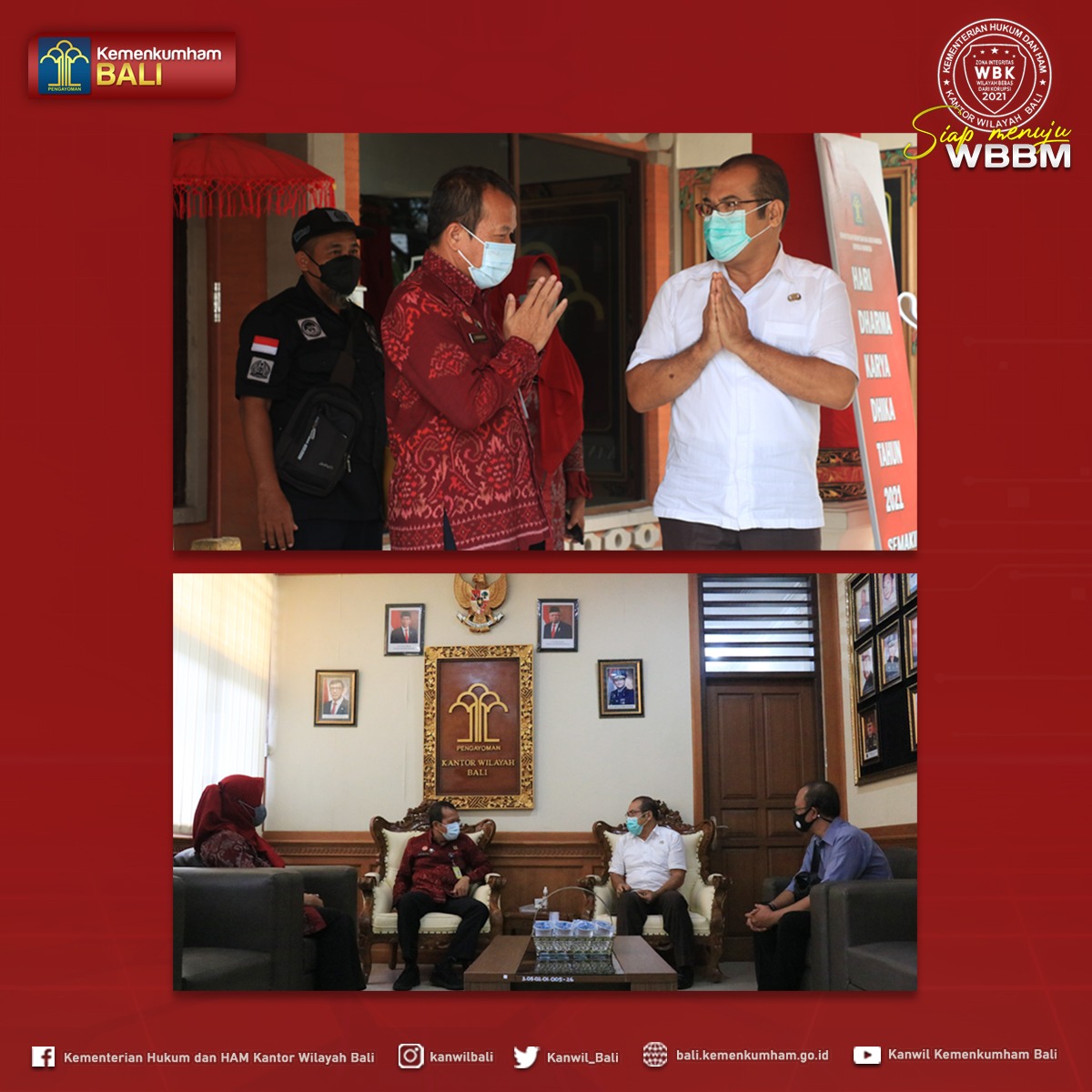 ( Vibizmedia – Bali) DENPASAR – Kepala Kantor Wilayah Kemenkumham Bali, Jamaruli Manihuruk menerima audiensi dari Kepala Badan Kesatuan Bangsa dan Politik Provinsi Bali, Dewa Putu Mantera yang didampingi Kepala Subbidang Kewaspadaan Dini, Agus Santoso pada Jumat, 21 Januari 2022. Bertempat di Ruang Arjuna Kanwil Kemenkumham Bali, turut mendampingi pula Kepala Bidang Perizinan dan Informasi Keimigrasian, Taty Sufiani dan Kepala Subbidang Intelijen Keimigrasian, Rahmat Gunawan.