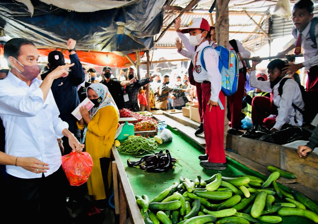 Presiden Joko Widodo menyerahkan bantuan tunai bagi para pedagang di Pasar Baru Tanjung Enim, Kabupaten Muara Enim, Provinsi Sumatera Selatan, pada Senin, 24 Januari 2022. FOTO: BIRO PERS SETPRES