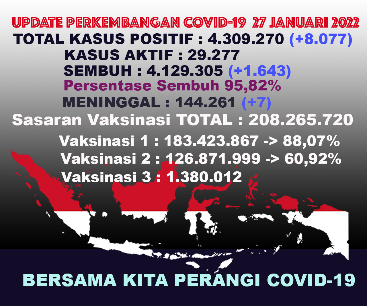 (Vibizmedia – Nasional) Berikut adalah angka akumulatif perkembangan data kasus Covid-19 dari seluruh Indonesia hingga tanggal 27 Januari 2022.