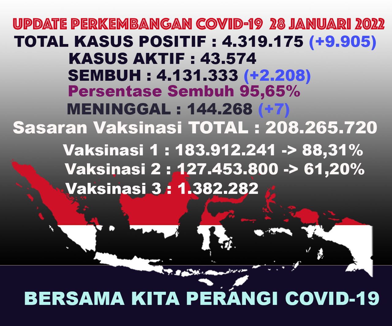 (Vibizmedia – Nasional) Berikut adalah angka akumulatif perkembangan data kasus Covid-19 dari seluruh Indonesia hingga tanggal 28 Januari 2022.