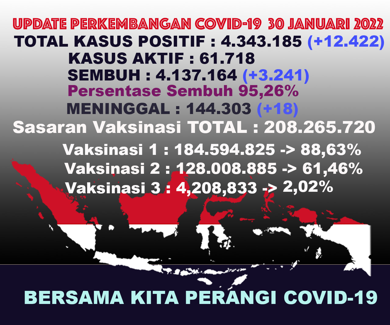 (Vibizmedia – Nasional) Berikut adalah angka akumulatif perkembangan data kasus Covid-19 dari seluruh Indonesia hingga tanggal 30 Januari 2022.