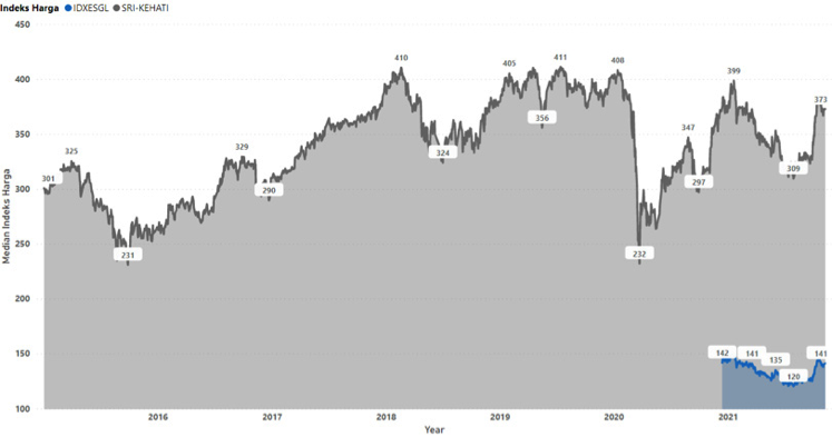 Indeks ESG (Environmental, Social, Governance) merupakan indeks yang mengukur kinerja pergerakan harga saham perusahaan atau emiten yang memiliki kegiatan pada sektor Lingkungan, Sosial, dan Tata Kelola (LST). Indeks yang termasuk kedalam kelompok ESG (Environmental, Social, Governance) adalah IDXESGL dan SRI-KEHATI. Indeks IDXESGL dirilis untuk mengukur kinerja harga dari saham perusahaan yang tidak terlibat pada kontoversi lingkungan secara signifikan dan memiliki penilaian lingkungan, sosial dan tata Kelola yang baik dari Sustainalytics serta memiliki transaksi serta kinerja keuangan yang baik. Sementara itu indeks SRI (Sustainable and Responsible Investment)– KEHATI dirilis untuk mengukur kinerja harga saham dari 25 perusahaan tercatat dengan kinerja baik, mendorong usaha berkelanjutan, memiliki kesadaran terhadap lingkungan hidup, sosial, dan tata kelola perusahaan yang baik. Indeks SRI-KEHATI dirilis sejak tahun 2009, sedangkan indeks ESGL dirilis pada tahun 2020. Dengan membandingkan kondisi tahun 2015 dan 2020 disaat Bursa Saham mengalami penurunan IHSG terbesar, harga saham perusahaan yang termasuk dalam kelompok ESG menunjukan harga saham yang sama pada nilai 230.
