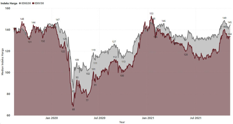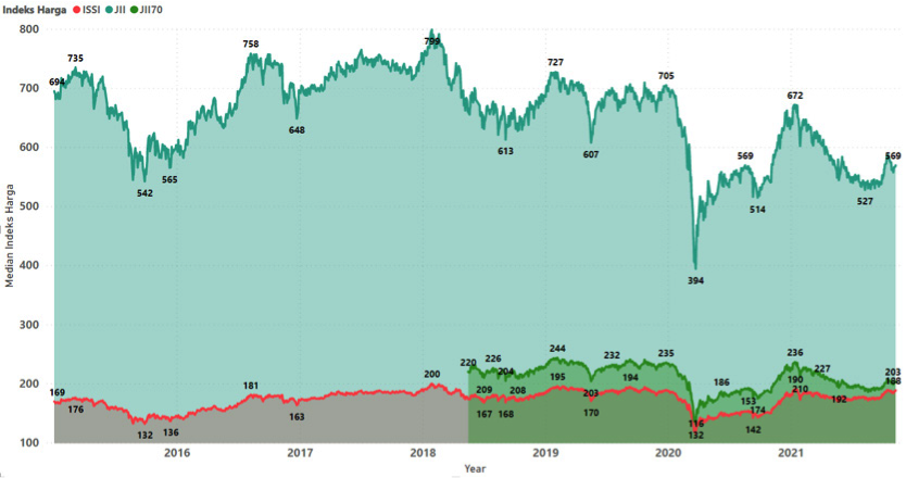 Indeks Saham Syariah Indonesia (ISSI) merupakan indeks yang mengukur kinerja harga seluruh saham Syariah yang tercatat di Papan Utama dan Papan Pengembangan. Sedangkan Indeks JII 30 dan 70 dirilis untuk mengukur kinerja pergerakan harga saham Syariah yang memiliki kinerja keuangan dan likuiditas transaksi pada kelompok perusahaan 30 tertinggi dan 70 tertinggi. Dengan membandingkan pergerakan harga saham pada ketiga indeks, perusahaan pada kelompok 30 perusahaan Syariah dengan likuiditas tertinggi mengalami kontraksi pada masa pandemi hingga di level harga 394, dan lebih rendah dibandingkan pada tahun 2015.