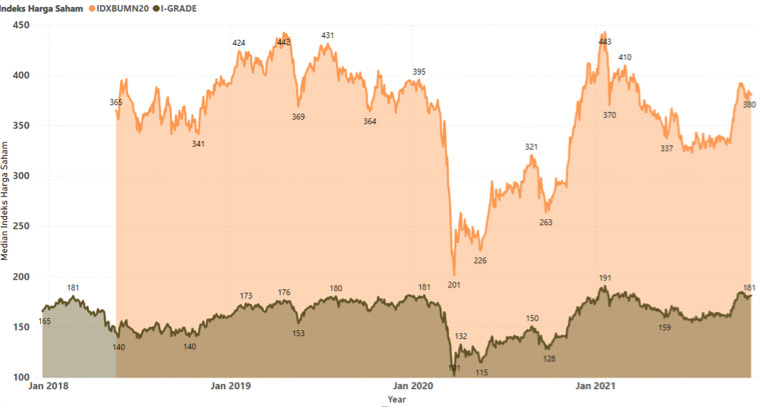 Pada periode awal pandemi di tahun 2020 kinerja pergerakan harga saham antara indeks bumn20 dan pefindo I-Grade menunjukkan pola yang sama untuk harga per lembar saham 101 untuk kelompok perusahaan menurut Pefindo I-Grade. Selain isu covid-19 adanya sentiment negatif kerugian yang dialami BUMN Indonesia juga mengakibatkan kontraksi harga saham BUMN di awal pandemi.