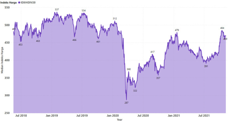 Indeks deviden merupakan indeks yang menggambarkan pergerakan harga saham perusahaan berdasarkan dividen yang dibagikan. BEI merilis indeks HIDIV20 untuk mengukur kinerja harga dari 20 saham yang membagikan dividen tunai selama 3 tahun terakhir dan memiliki dividen yield yang tinggi.Indeks ini pertama kali dirilis pada 17 Mei 2018. Pada gambar 11 dapat dilihat pergerakan harga saham untuk perusahaan yang membagikan devide selama tiga tahun terakhir.
