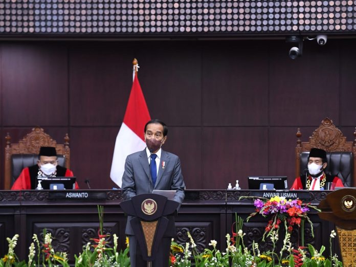“Saya yakin dan percaya dengan transformasi yang dilakukan, MK akan menemukan momentum menyiapkan langkah lebar untuk melakukan lompatan kemajuan, mengukuhkan peran sebagai pengawal dan penjaga konstitusi,” ujar Presiden saat memberikan sambutan dalam Sidang Pleno Khusus Penyampaian Laporan Mahkamah Konstitusi Tahun 2021 di Ruang Sidang Mahkamah Konstitusi, Jakarta, pada Kamis, 10 Februari 2022.