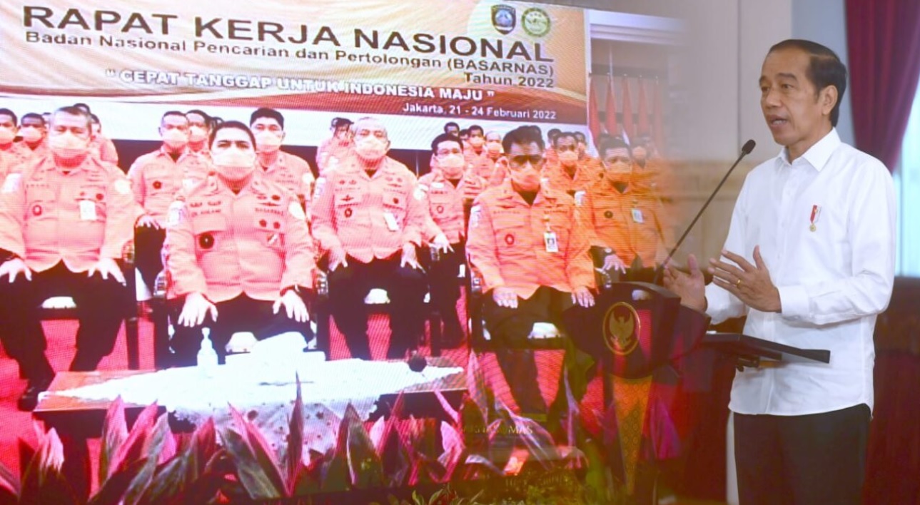 Presiden Joko Widodo membuka secara resmi Rapat Kerja Nasional (Rakernas) 50 Tahun Emas Badan Nasional Pencarian dan Pertolongan (Basarnas) yang digelar melalui konferensi video di Istana Negara, Jakarta, pada Senin, 21 Februari 2022. FOTO: BIRO PERS SETPRES