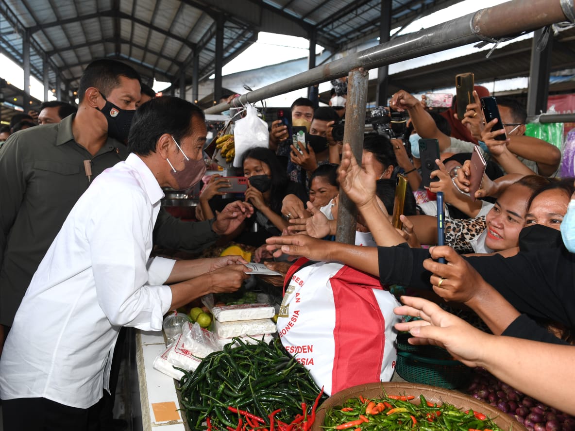 Presiden Jokowi menyerahkan bantuan langsung tunai kepada para pedagang yang ada di Pasar Kebun Lada, Kota Binjai, pada Jumat, 4 Februari 2022. FOTO: BIRO PERS SETPRES