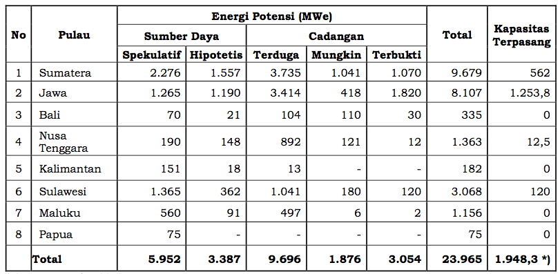Berdasarkan data dari Handbook of Energy & Economic Statistics of Indonesia 2019 yang diterbitkan oleh Kementerian ESDM, total potensi energi panas bumi sebesar 23.965 MWe yang terdiri dari sumber daya sebesar 9.339 MWe dan cadangan 14.626 MWe.