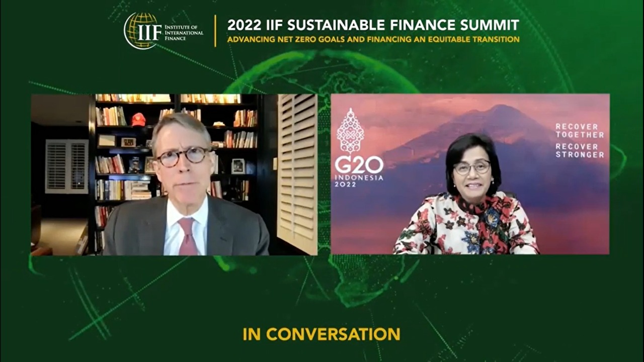 “Tapi ini (isu perubahan iklim) bukan hanya masalah Indonesia. Kami juga berdiskusi dengan negara-negara anggota G20 melalui G20 Sustainable Finance Working Group dan juga dengan UNFCCC melalui COP-26 di mana banyak negara juga memberikan komitmen mereka untuk mengurangi CO2,” demikian Menteri Keuangan (Menkeu) Sri Mulyani Indrawati sampaikan ketika berbicara pada forum IIF Sustainable Finance Summit 2022 secara daring, Kamis (10/03).