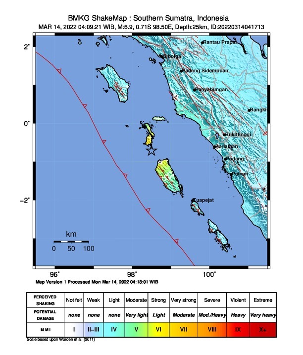 Pantuan BMKG mencatat kekuatan gempa yang diukur dengan skala Modified Mercalli Intensity (MMI) menunjukkan IV MMI di wilayah Nias Selatan, dan III MMI di Padang, Siberut, dan Gunung Sitoli. Selang 30 menit setelahnya, gempa susulan terjadi dengan skala yang lebih kecil yakni (M)6,0.