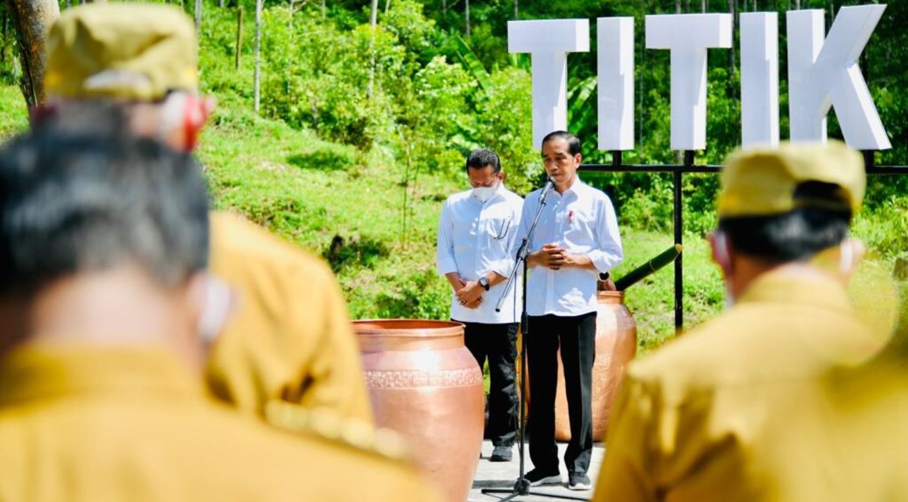 Presiden Joko Widodo memberikan sambutan di Kawasan Titik Nol IKN, di Kabupaten Penajam Paser Utara, Provinsi Kalimantan Timur, pada Senin, 14 Maret 2022. FOTO: BIRO PERS SETPRES