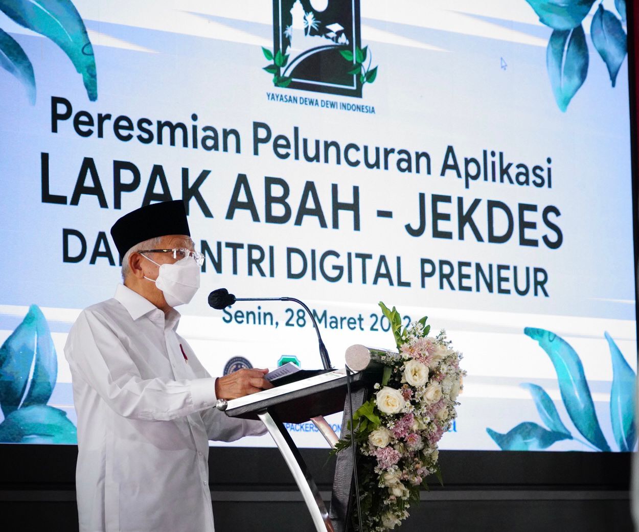 “Terobosan-terobosan ini meningkatkan peluang bagi UMKM di desa untuk memperluas pasarnya, ini programnya Pak Gubernur, baik di tingkat lokal maupun nasional, serta mempermudah distribusi hasil pertanian masyarakat desa,” tutur Wakil Presiden (Wapres) K.H. Ma’ruf Amin pada acara Peresmian Peluncuran Aplikasi Lapak Abah – Ojek Desa dan Santri Digitalpreneur di Kantor Bupati Purwakarta, Jalan Ganda Negara Nomor 11A, Nagri Kidul, Purwakarta, Jawa Barat, Senin (28/03/2022).