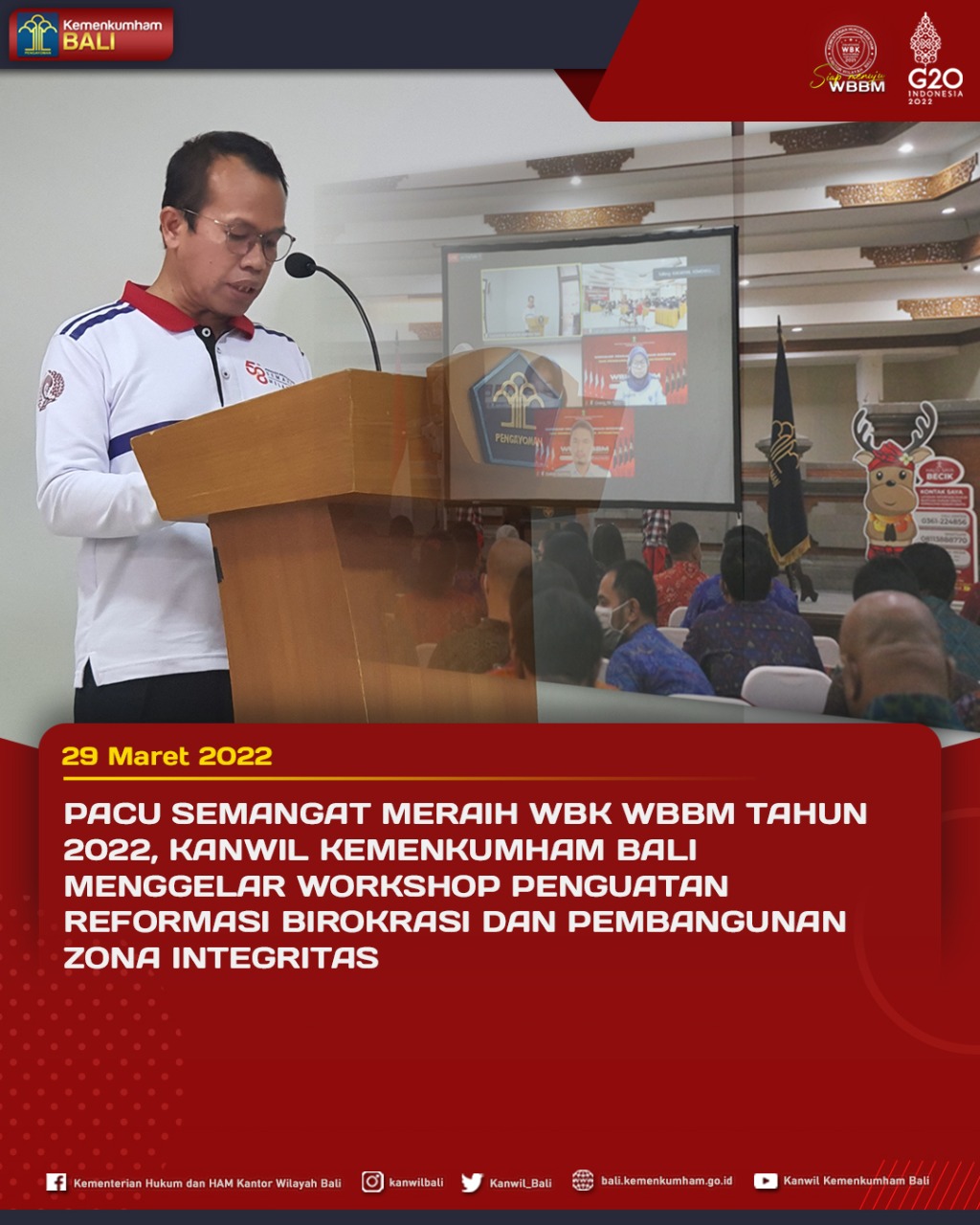(Vibizmedia – Bali) DENPASAR – Guna menciptakan birokrasi pemerintah yang profesional, berintegritas dan bebas dari KKN (Korupsi, Kolusi dan Nepotisme), Kantor Wilayah Kementerian Hukum dan HAM Bali menyelenggarakan Kegiatan Workshop Penguatan Reformasi Birokrasi dan Pembangunan Zona Integritas Menuju WBK (Wilayah Bebas dari Korupsi) dan WBBM (Wilayah Birokrasi Bersih dan Melayani) Bertempat di Ruang Darmawangsa Kantor Wilayah Kementerian Hukum dan HAM Bali, Senin (29/03). Kegiatan workshop yang terselenggara secara hybrid ini dihadiri oleh Kepala Kantor Wilayah Kementerian Hukum dan HAM Bali (Jamaruli Manihuruk) dan Kepala Divisi Administrasi (Mamur Saputra) secara daring melalui Zoom Meeting. Dalam kesempatan tersebut juga hadir secara langsung Pejabat Administrator dan Pejabat Pengawas Kanwil Kemenkumham Bali serta perwakilan Tim Pokja (Kelompok Kerja) Pembangunan ZI (Zona Integritas) baik dari Kantor Wilayah dan seluruh UPT (Unit Pelaksana Teknis) di Lingkungan Kantor Wilayah Kementerian Hukum dan HAM Bali.