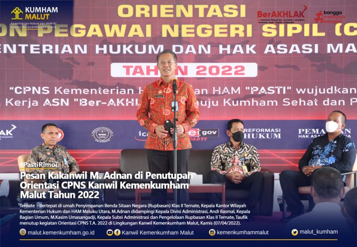 (Vibizmedia – Malut) Ternate, malut.kemenkumham.go.id – Bertepat di rumah Penyimpanan Benda Sitaan Negara (Rupbasan) Klas II Ternate, Kepala Kantor Wilayah Kementerian Hukum dan HAM Maluku Utara, M.Adnan didampingi Kepala Divisi Administrasi, Andi Basmal, Kepala Bagian Umum, M.Kasim Umasangadji, Kepala Subsi Administrasi dan Pengelolaan Rupbasan Klas II Ternate, Taufik menutup kegiatan Orientasi CPNS T.A. 2022 di Lingkungan Kanwil Kemenkumham Malut, Kamis (07/04/2022).