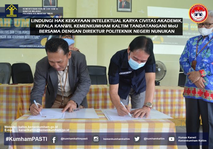 (Vibizmedia – Kaltim) Nunukan – Kamis, 14 April 2022 . Kepala Kantor Wilayah Kementerian Hukum dan HAM Kalimantan Timur (Sofyan) didampingi Kepala Divisi Pelayanan Hukum dan HAM (Sri Lastami), Kepala Lembaga Pemasyarakatan Kelas IIB Nunukan (I Wayan Nurasta Wibawa) dan Kepala Kantor Imigrasi Kelas II TPI Nunukan (Washington Saut Dompak) hadiri Penandatanganan Memorandum of Understanding (MoU) Bidang Kekayaan Intelektual dengan Politeknik Negeri Nunukan (PNN). Acara turut dihadiri oleh Direktur Politeknik Negeri Nunukan (Arkkas Viddy), Wakil Direktur II Dr.Rafiqoh, Koordinator Akademik dan Kemahasiswaan H.Trisno Hadi, para Kajur, Sekjur dan Kaprodi Politeknik Negeri Nunukan.