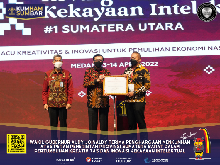 Penghargaan diserahkan pada pembukaan Kegiatan Roving Seminar Kekayaan Intelektual yang dilaksanakan oleh Direktorat Jenderal Kekayaan Intelektual (DJKI) di Hotel JW Marriot Medan, Rabu (13/4). Salah satu Pemerintah Provinsi yang memperoleh penghargaan dari Menkumham tersebut adalah Pemprov Sumatera Barat. Penghargaan diterima langsung oleh Wakil Gubernur Sumatera Barat, Audy Joinaldy.
